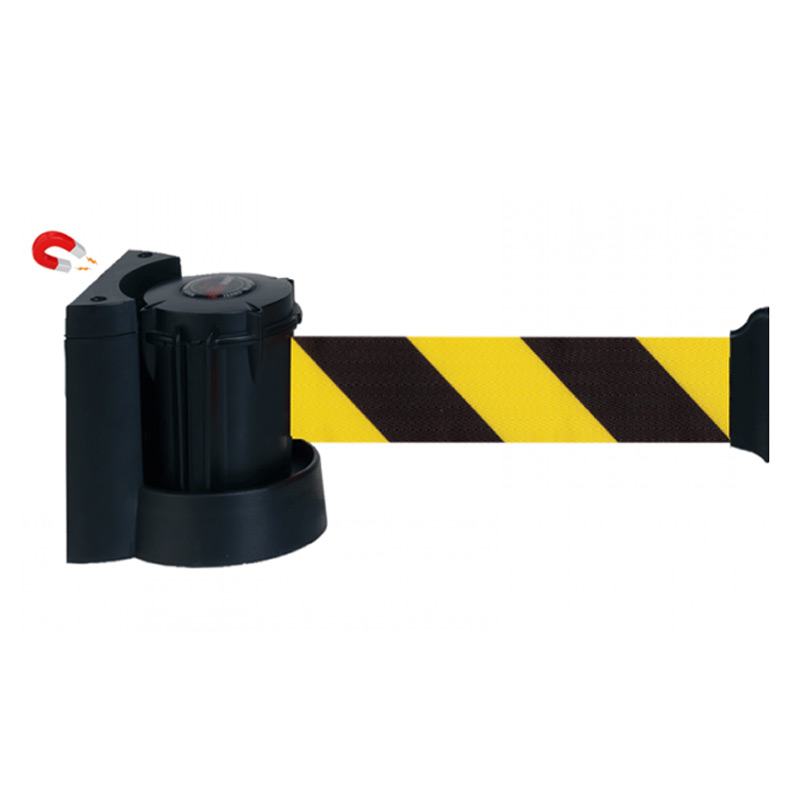 Soporte magnético con cinta retráctil para delimitar zonas. Compacto y eficiente.