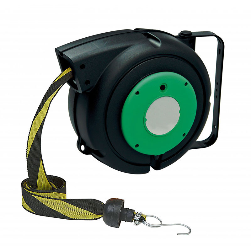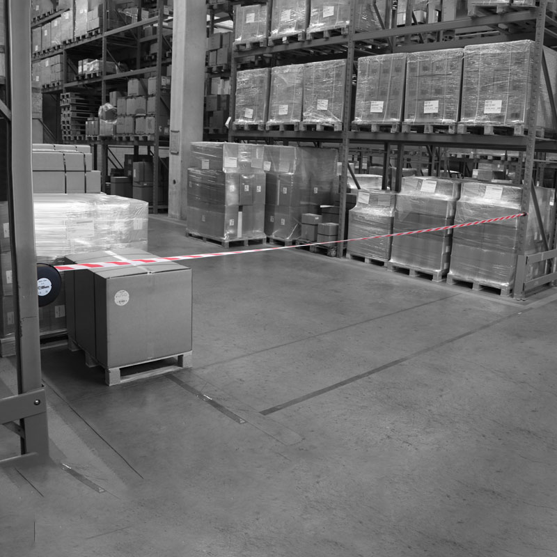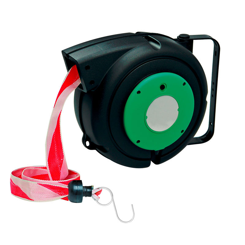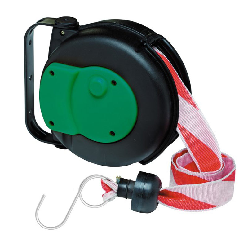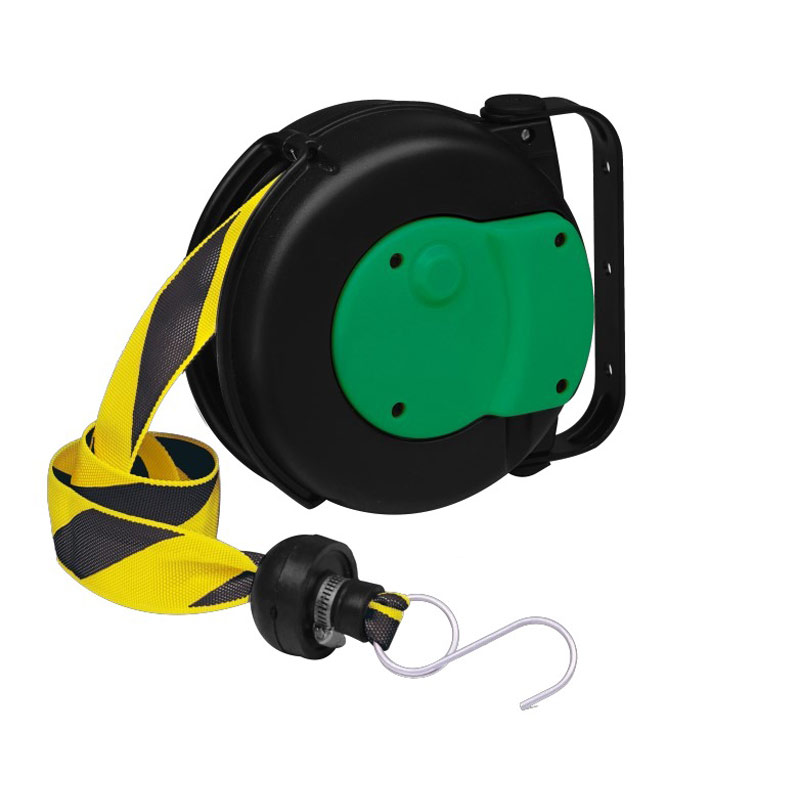 Soporte de pared con cinta retráctil para delimitar zonas de forma temporal.