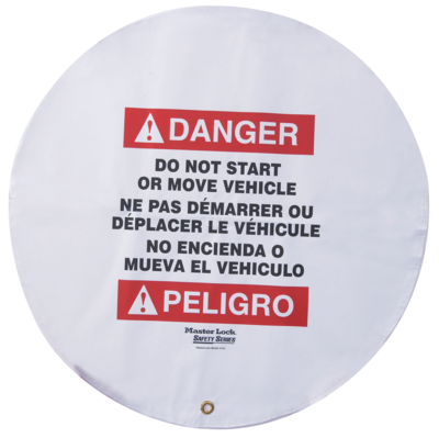 Advertencia en tres idiomas (francés, inglés y español) informando a los trabajadores de que no deben arrancar o mover el vehículo.